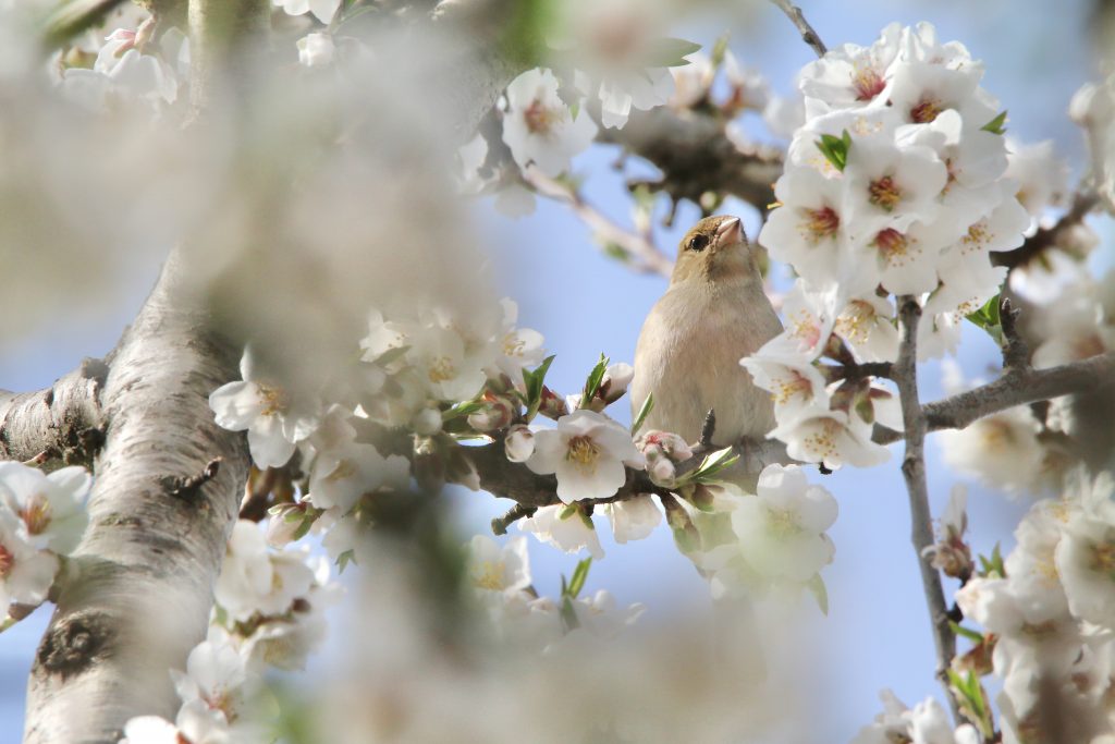 Les amandiers en fleurs servent de perchoirs et de cachettes à de nombreux oiseaux. Ce jour-là, c’est toute une colonie de pinsons des arbres qui a accompagné nos pas.