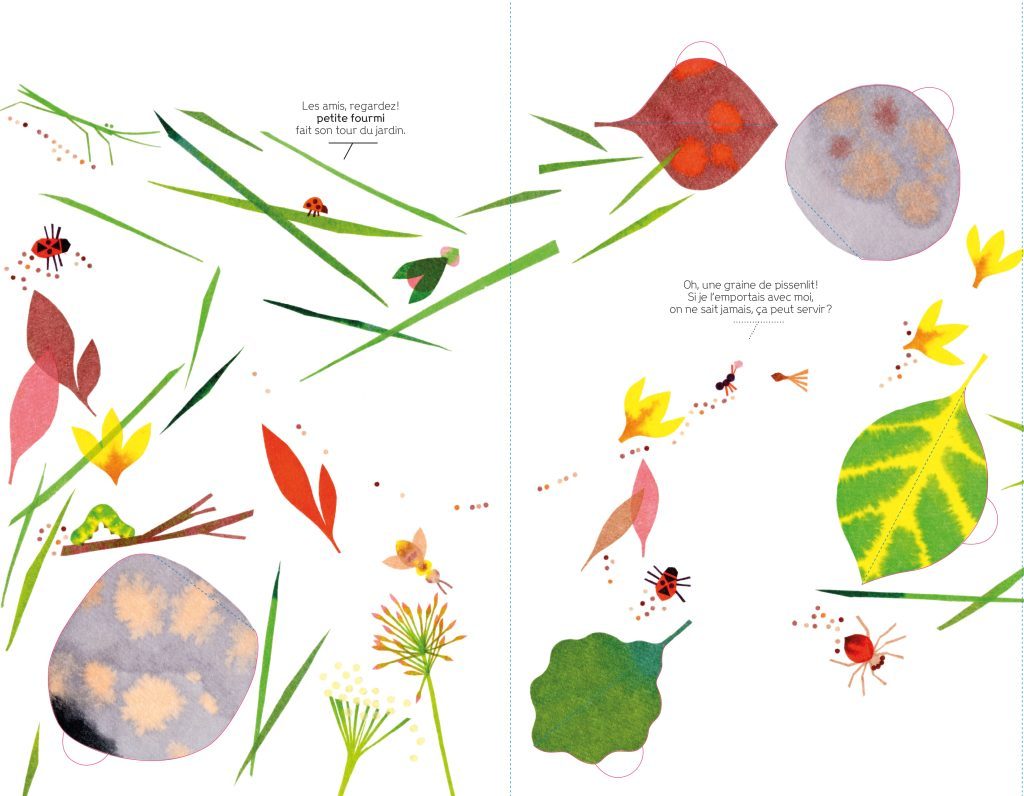 Avec des flaps et des découpes, cet album se lit plié comme déplié. Les caches, rabats et effets donnent l’illusion d’une véritable fourmilière que l’on découvre comme au travers d’une loupe. La vie grouille dans cette fourmilière et chacun est bien occupé ! Page à page, le lecteur, tout comme une fourmi, voit apparaitre de merveilleuses trouvailles : insectes, graines, brindille …