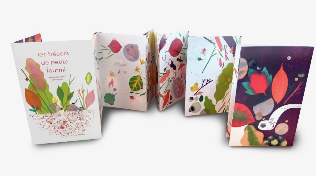Observer les fourmis est une activité enrichissante, notamment pour les enfants. Cela leur permet de s’ouvrir à un monde différent et pourtant tellement proche du notre. Dans l’album leporello « Les trésors de petite fourmi » d’Anouck Boisrobert et Louis Rigaud paru chez Hélium, les jeunes lecteurs pourront suivre le parcours d’une fourmi, sur et sous la terre …