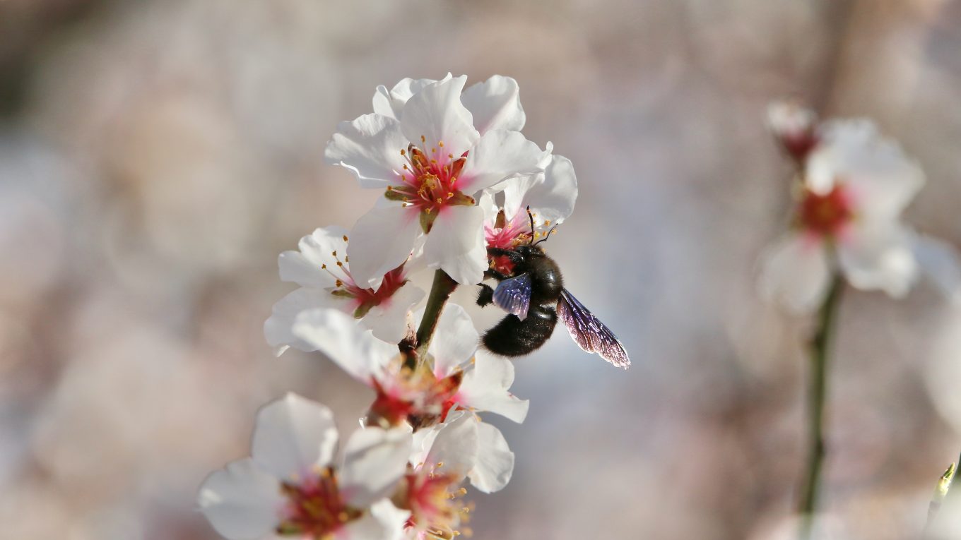 Dans le jardin, la floraison des amandiers annonce le retour progressif d’une faune plutôt discrète ces derniers mois. Les escargots sortent de leur hibernation tandis que les premiers butineurs se gavent du précieux nectar des fleurs d’amandiers. Les abeilles, les bourdons et les vrombissants xylocopes profitent allègrement de la floraison abondante de ces arbres à une époque de l’année où les fleurs mellifères sont encore rares.